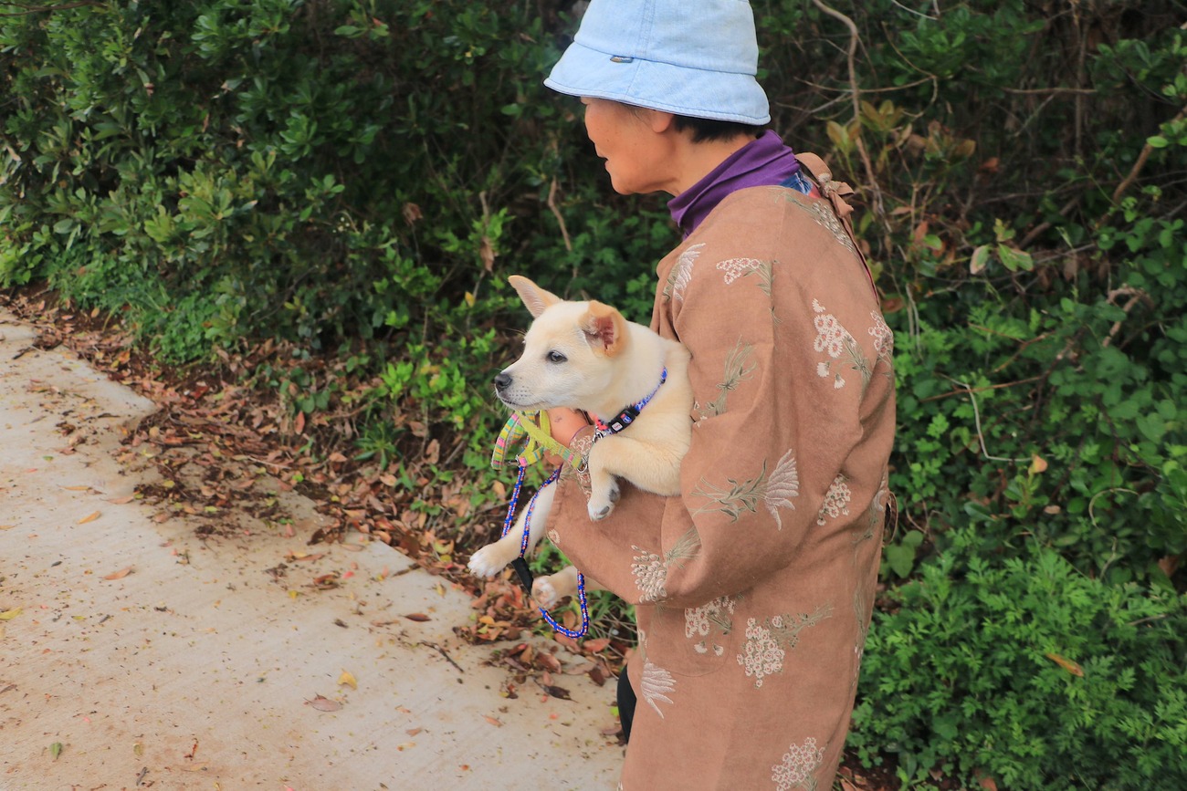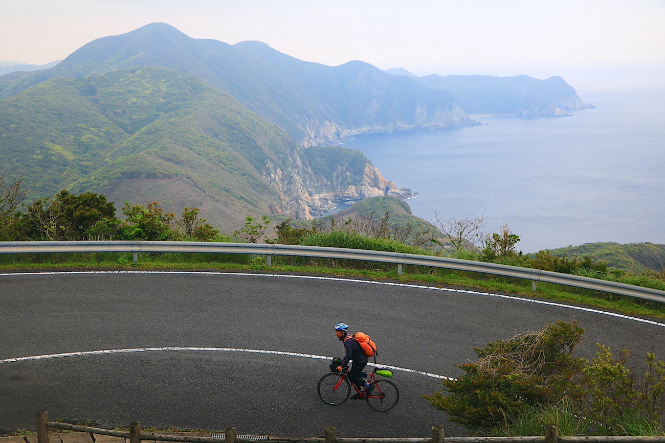 翌日、雨は降らないという天気だったので、距離100km以上の福江島一周をスタート。まずはじめに島のトレードマークである鬼岳(おにだけ、標高315m)を訪れました。草原に覆われた山からは、島の南部を一望。パッチワークのように広がる田園地帯が、まさに同じ九州の南阿蘇のようだと感動したことを覚えています。下山後、鎧瀬(あぶんぜ)海岸という景勝地を訪れたとき、愛犬・次郎ちゃんと散歩をしていた「スミ子さん」に声をかけてもらい、自宅で朝食を食べさせていただくことに。初対面とは思えない団欒の時間を過ごし、島の人の温かさに触れました。その後、前半はひたすらアップダウンに富んだ福江島南部を駆け抜けました。中でも大瀬崎灯台がみられる大瀬崎園地までのヒルクライムのキツさは一生忘れません。