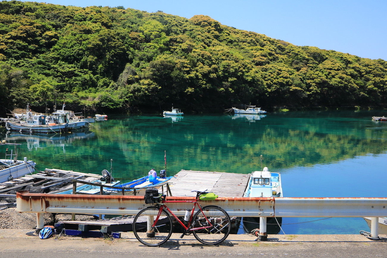 4日目は福江島から、中通島(なかどおりじま)へ。上五島から下五島へ入ります。旅の道中、束の間の船旅は旅情を高めてくれますね。中通島の奈良尾港ではコインロッカーに荷物を預けて軽量化をしました。身軽になれば、島のアップダウンに富んだ地形に挑むハードルを下げることができます。奈良尾港の裏にある米山展望台では、若松の瀬戸を通過するフェリーや、周囲の真っ青な海を一望。島旅の旅情を存分に味わいました。その後、中通島の西側のルートを自転車で走ったのですが、ここで五島列島の自然のポテンシャルの高さに感動します。桐集落の周辺には、ターコイズブルーの海へ、周囲の緑が映り込み、宝石のように輝く海が広がっていたのです。そんな景色と調和するのは、漁に出る漁船や人々の暮らしの風景。桐教会が見守る、古き良き、そして美しい五島列島の原風景を垣間見ました。