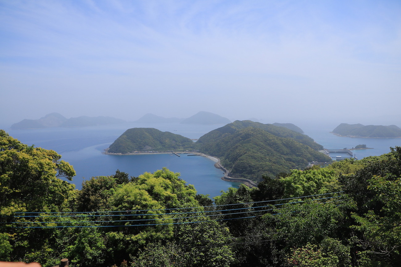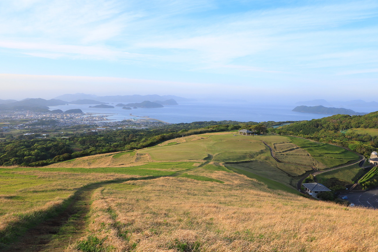 登山開始から約30分、360度開けた山頂へ到着すると、北部・五島列島の島々、福江の港町、南部の田園地帯など、最果て感漂う壮大な風景を楽しめます。なんだか安寧を求めて移住したキリシタンの心が分かるようです。