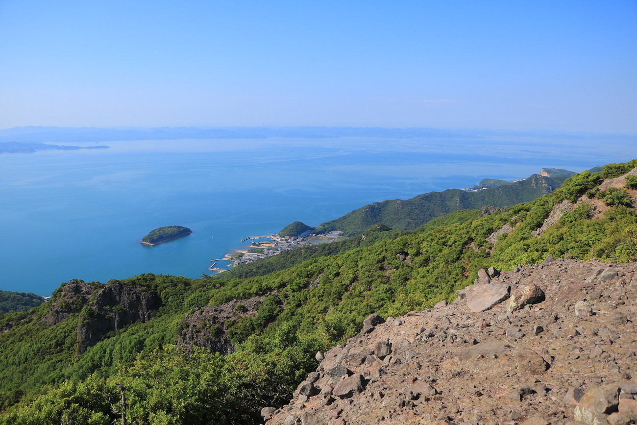 スタートから1時間ほどで、7合目の展望台へ到着します。すると眼下には、小豆島西部・前島と四国まで一望。吸い込まれるような大パノラマが展開します。山頂では豊島を望み、四方に海を見渡す高度感たっぷりの山。野趣に富んだ登山道も魅力の一つです。