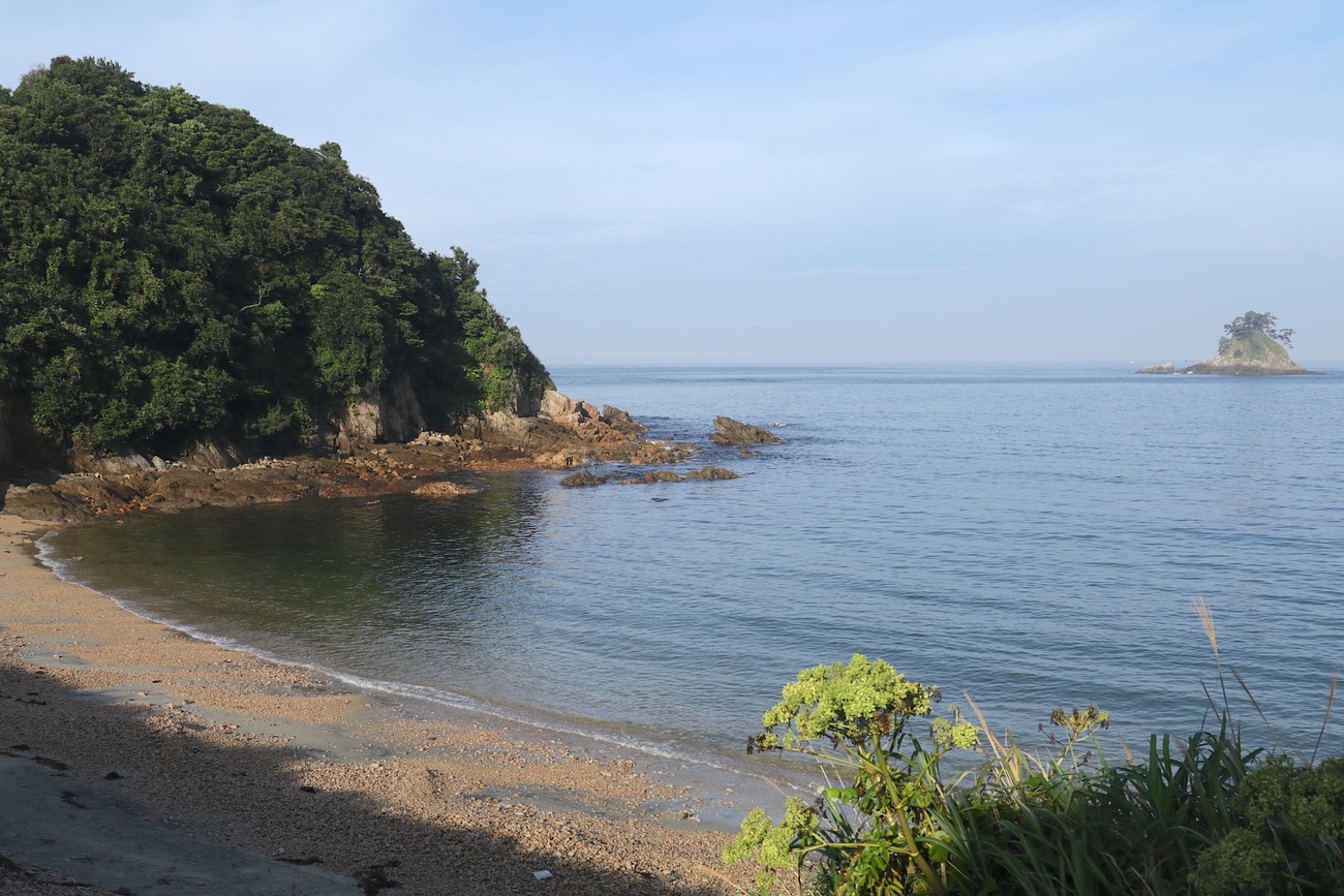 日間賀島の隣、篠島で取り上げたい楽しみ方は、南部の太一岬ハイキングです。篠島海水浴場の南部から、野趣ある海岸沿いの道を4kmほど歩き、2つの展望台を巡ります。三河湾にこれほど秘境らしさを感じる場所があったのか?と感動の連続が待つハイキングコースです。海とスレスレの道をいく前半は野趣があり、先端の太一岬に到着すると、伊勢湾から鳥羽や神島、伊良湖まで望むことができます。古来より、伊勢神宮を望む地であり、伊勢神宮の遷宮で譲り受けた古材を使用した鳥居が立てられているパワースポットです。岬の西側には、万葉集で詠われた場所があり、東海の松島と呼ばれる風景が広がります。また、名古屋城の築城に使おうとしたものの、あまりに大きすぎて船に積めなかったという逸話が残る清正の枕石という場所もあり、コンパクトなコースの中にさまざまな島の歴史が詰まっています。
