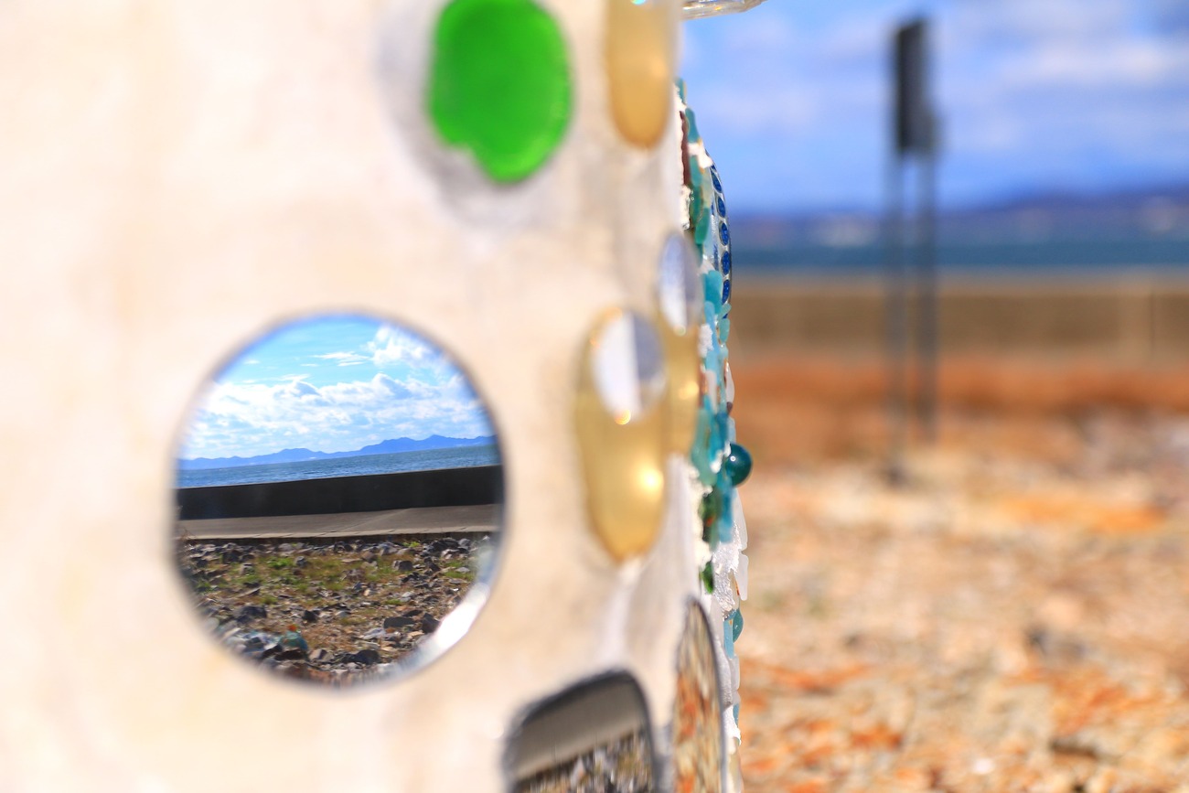 アートと並んで島の見どころと言えるのが、個性的な海岸です。例えば、東部に位置する「新谷海岸」は、ふかふかの砂浜と海食崖が続き、鮮やかで美しい海が広がっています。ここは愛知県とは思えないほど秘境感にあふれた風景が楽しめます。そして、この浜辺の砂をよく見ると、ほんのり紫色に染まっていることに気づくはず。これはムール貝やウチムラサキ(大あさり)のかけらが砂に混じっているためです。全国的にも珍しい、ほんのり紫色を帯びた浜辺はロマンチックな雰囲気を醸し出しています。また港から一番離れた高千谷(たかちや)海岸には、ミクロな宇宙を表現するアート作品・星を想う場所が展示されています。カラフルなシーガラスが散りばめられ、バックミラーに映り込む海の風景が見事。色々なものが漂着する島の海岸が、まさに宇宙のように感じられる作品です。