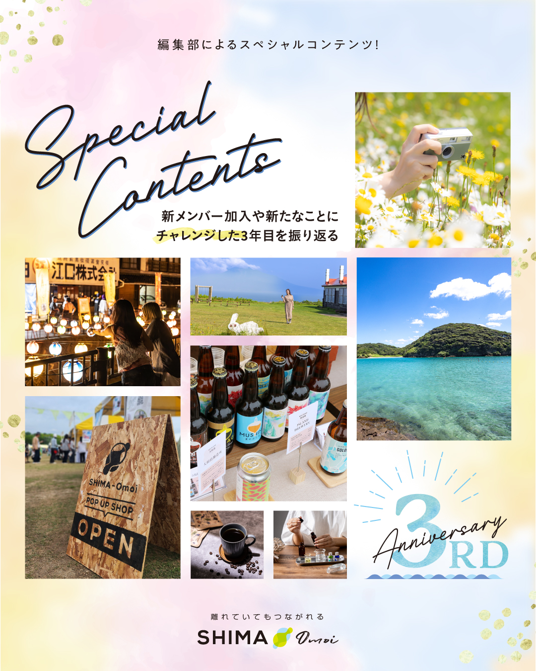SHIMA-Omoiはおかげさまでサイト開設から3周年を迎えることができました。編集部に新しいメンバーが2人加入し、初めてイベントに出展して直接お客さんに離島の魅力を伝えたりと新しい取り組みを行ったこの1年を振り返る座談会を開催。Shima旅ロケの秘話やおもしろかったエピソード、イベント出展などデジタル発信を超えたSHIMA-Omoiの活動への想いなど盛りだくさんの内容です!