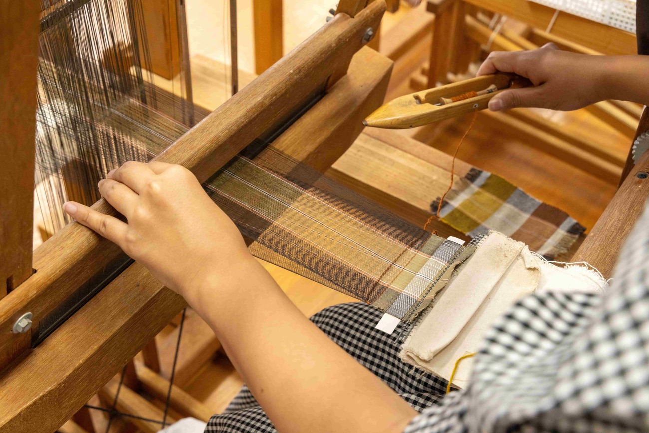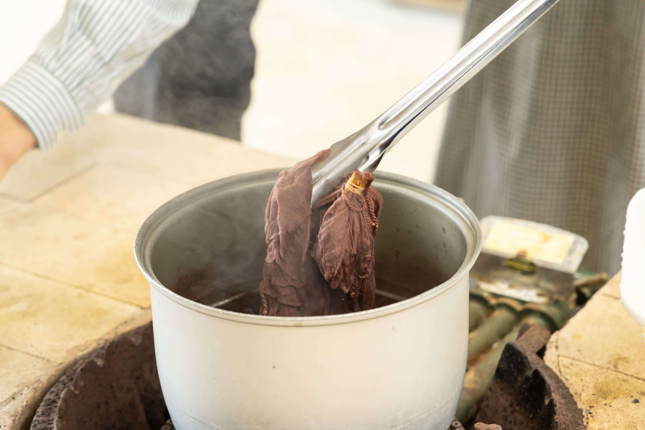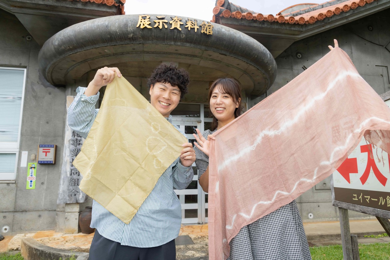 沖縄県久米島町で伝統的に織られている絹織物「久米島紬(くめじまつむぎ)」は、図案、染め、織りの全工程を一人で行い、島の草木や泥で染め上げる伝統の絣柄(かすりがら)としなやかな艶が特徴です。島の北西部に位置する真謝(まじゃ)地区の「久米島紬の里 ユイマール館」では、この久米島紬の織り染め体験が楽しめます。特におすすめなのが、織り染め体験がセットになった「コースター織り&バンダナ染め」コースです。まずコースター織りでは、久米島紬と同じ織り機を使って織り体験を行います。織り機のペダルに足が届く(身長約120cm以上)お子さんから体験できるので、小学1年生ごろのお子さんでも楽しめます。一つひとつ織ることに没頭する時間は、日常から頭を切り替えてリフレッシュできるひとときです。続いてバンダナ染めでは、染めて開くまでどんな色合いになるか分からない楽しさがあります。開いてみると、染め手の個性が反映されていてとても面白いです。ぜひカップルや夫婦でお互いへのプレゼントとして制作してみてはいかがでしょうか?