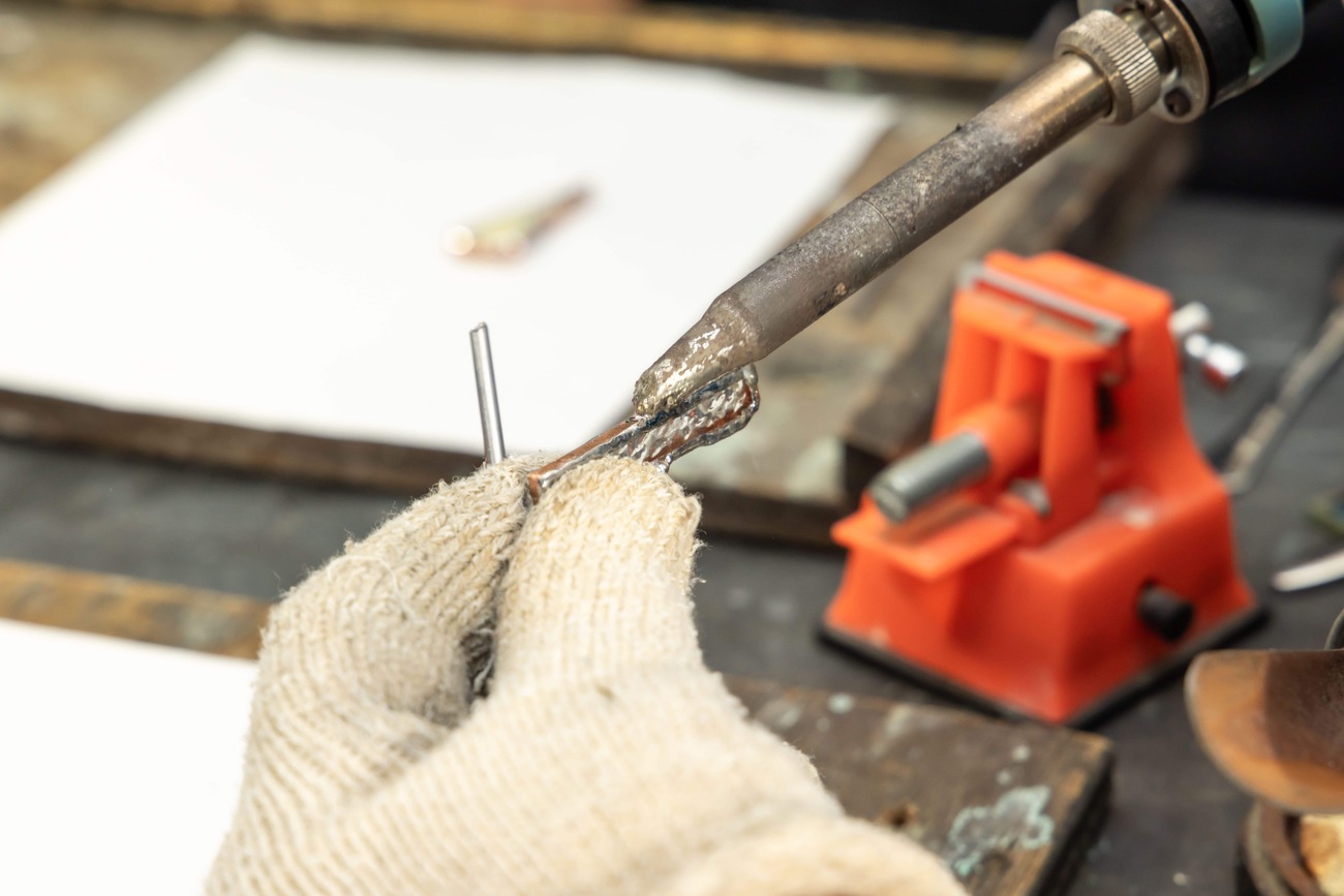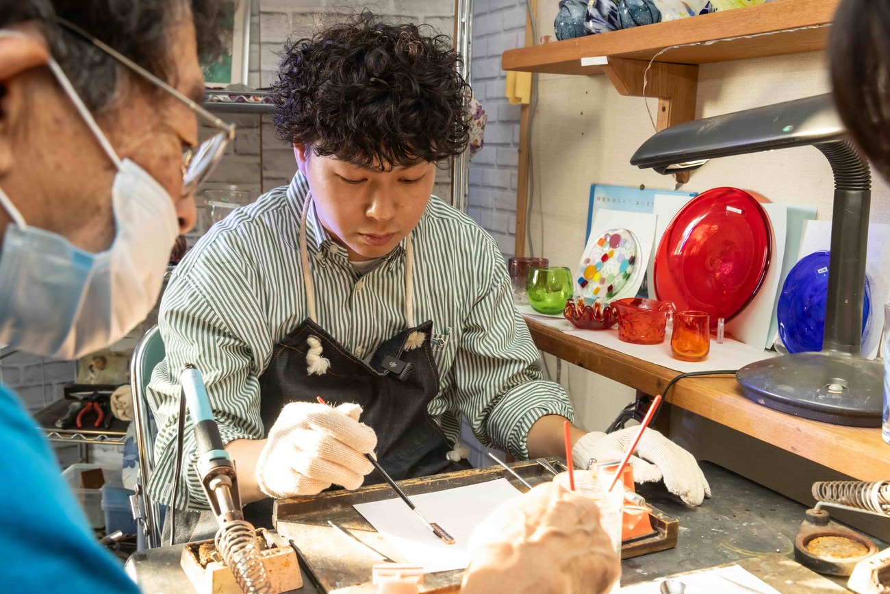 兼城港フェリーターミナル近くの仲泊(なかどまり)地区にある「琉球ガラス工房 瑠璃蛍(るりぼたる)」では、色とりどりの泡盛の廃ビンなどを再利用した美しい琉球ガラスを使って、様々なガラス細工体験が楽しめます。キャンドルスタンドやランプシェードの制作には前日予約が必要ですが、ネックレスや携帯ストラップであれば当日でも受付可能です。まずは、豊富なバリエーションの中からお気に入りの琉球ガラスの破片を選びましょう。選んだガラスの破片をハンダごてを使って溶かした鉛で囲みます。この作業は少し緊張しますが、集中して行えばあっという間に終わります。一周きれいに覆ったら、ガラスの破片を固定し、金具を取り付けて完成です。手先が不器用な方でも、お店のスタッフが丁寧に教えてくれるので安心です。また、お店のスタッフから久米島の情報を聞いたり、気さくな会話を楽しむこともできます。工房はギャラリーも兼ねており、独特の輝きを放つ琉球ガラスの作品も鑑賞できます。ぜひふらっと気軽に立ち寄ってみてください。
