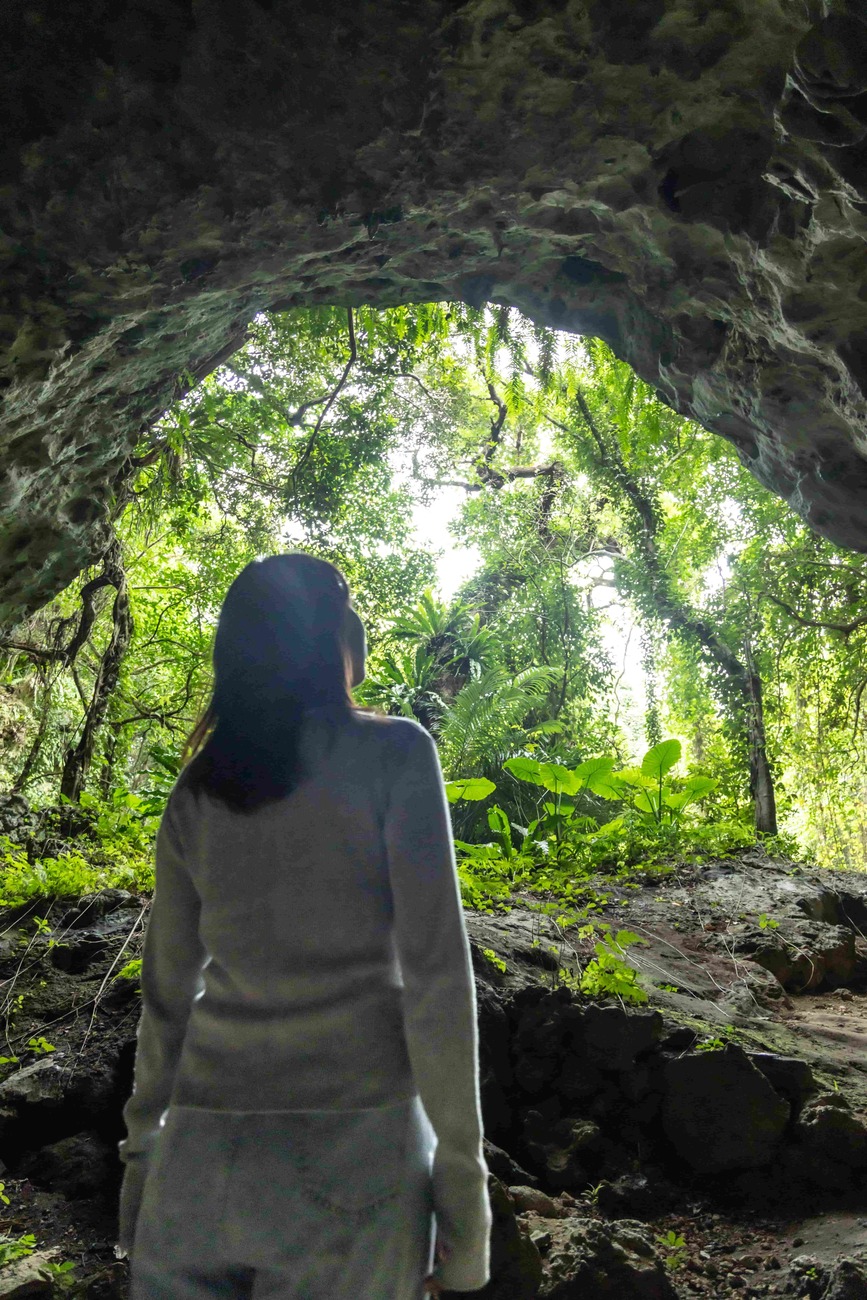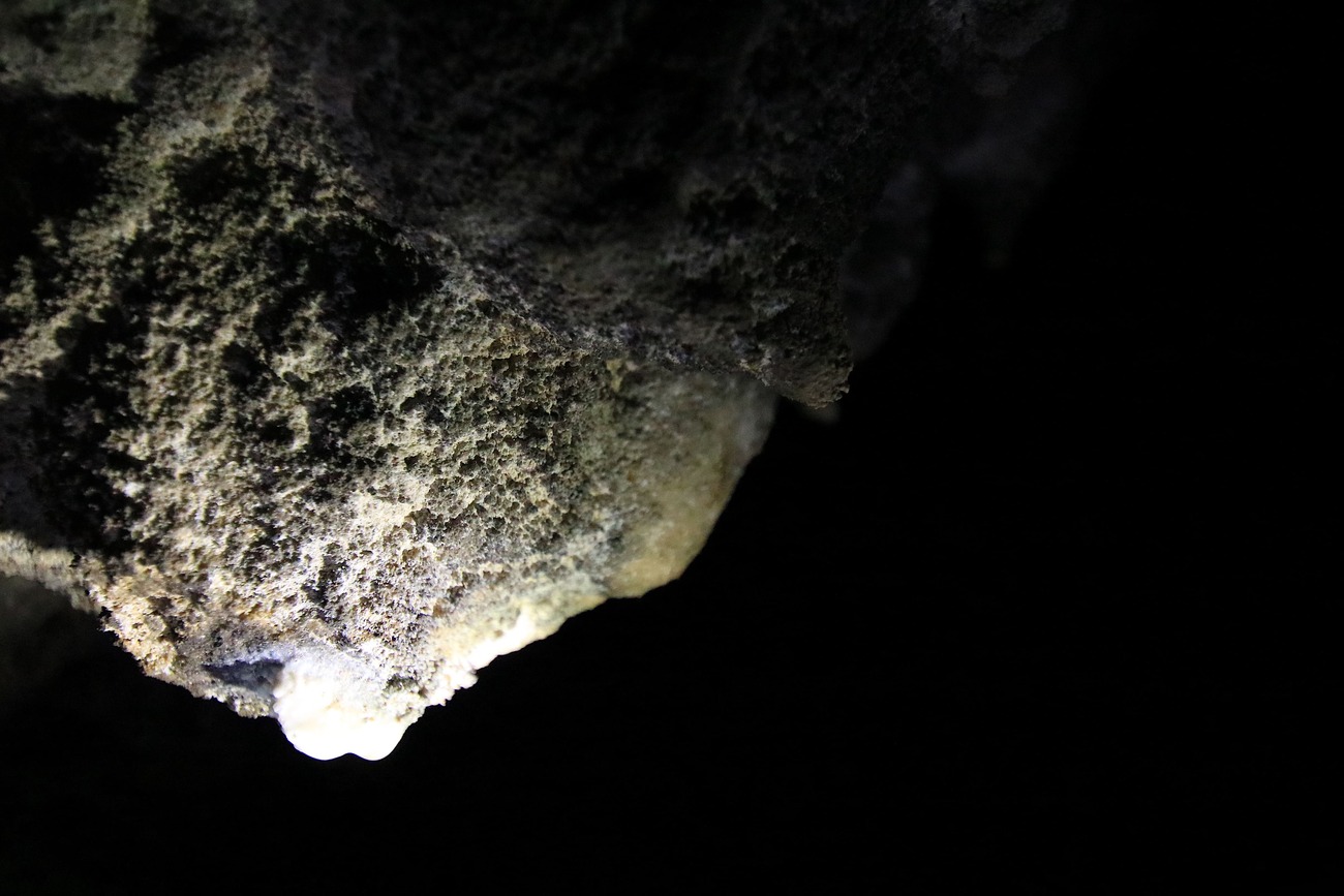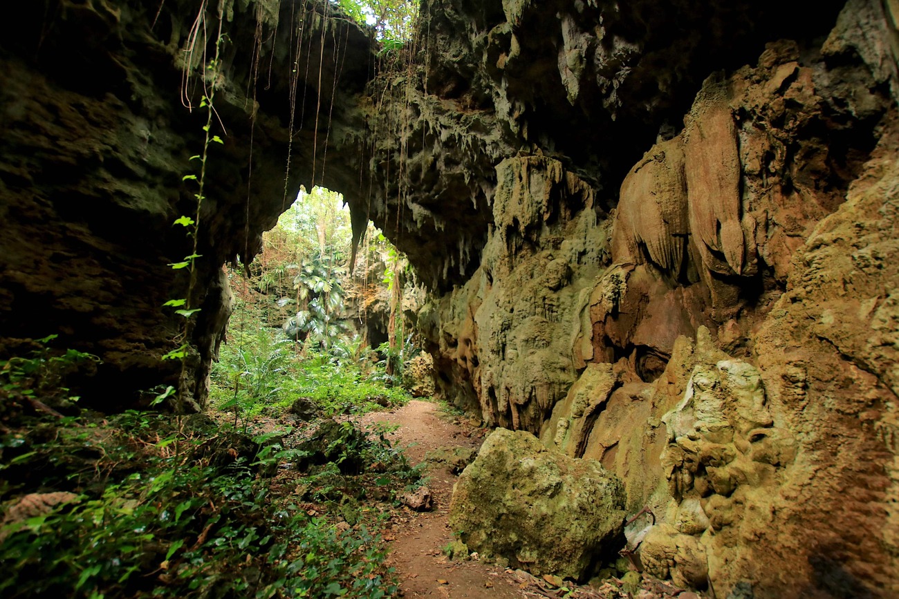 久米島空港からほど近い「ヤジヤーガマ洞窟」は、のどかな田園風景に突然現れる大きな洞窟で、自然の神秘とエネルギーを感じることができます。まるでRPGの世界を思わせる入口を進むと、全長800mの鍾乳洞が広がり、探検が始まります。洞内は真っ暗な空間なので、懐中電灯を持参して個人で訪れることもできますが、ヤジヤーガマの成り立ちや歴史をもっと深く知るためにも現地ガイド付きの体験ツアーがおすすめです。洞窟内では、光を当てると黄金色に輝く鍾乳石や、運が良ければ絶滅危惧種のオキナワコキクガシラコウモリが飛び交う様子、そして鍾乳石の上を触角を頼りに歩くクメカマドウマなどを観察できます。まるで未知の場所を手探りで進む冒険家のような気分を味わえるでしょう。洞窟内を約15分歩くと、暗闇の先に日光が差し込む場所に到達します。洞窟の終点は外に通じており、浸食された大地と緑が織りなす神秘的な景観が広がります。まるで妖精が住んでいそうな雰囲気が漂っています。そして、その傍らには人骨が置かれています。琉球地方では、魂を海の彼方の聖地ニライカナイに還すため風葬、洗骨、納骨が行われていました。洞窟の天井から差し込む陽光が人骨を照らす様子は、天からの祝福を受けているかのよう。死者の魂が自然に帰る様子を思い起こさせる神聖な場所です。