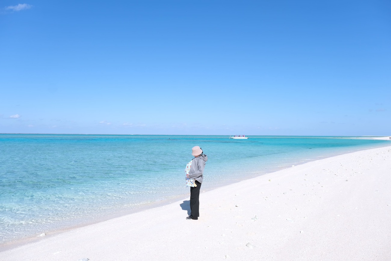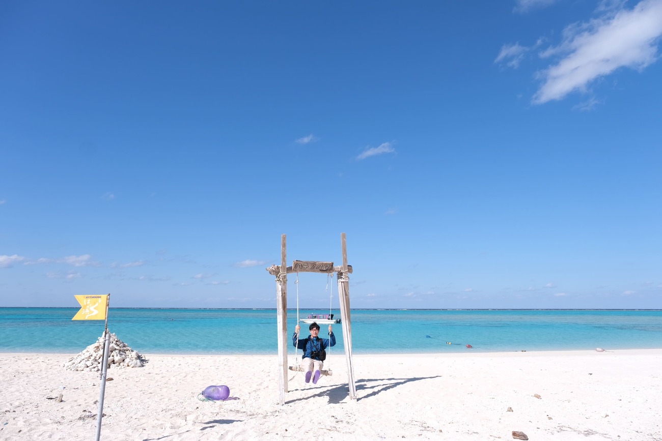 久米島を代表するビーチ「ハテの浜」は、夏のシーズン以外でも一年中楽しむことができます。多くのツアーが企画されていますが、特におすすめなのが久米島海洋レジャーの「ハテの浜ツアー」。1日2回開催され、泊フィッシャリーナから出発して往復約1時間のクルージングと、ハテの浜での1時間の滞在がセットになったツアーです。行きの船では、色とりどりに変化する久米島の海を眺めたり、ウミガメに出会うチャンスも。島に上陸する直前には、白い砂浜とターコイズブルーの海のコラボレーションには思わず息を呑みます。冬にハテの浜を訪れる魅力は、東洋一の美しさと謳われるハテの浜を独り占めできること。久米島は冬でも暖かい気候の日が多く、島ぞうりを履いて波打ち際を歩くこともできますよ。撮影スポットとしては、ブランコが人気。青と白の織りなす風景を背景に、爽快な気分でブランコを漕いでみて下さい。またハテの浜らしい最果て感を出したい場合、空を大きく切り取るのがコツです。曇りがちな冬でも、数日滞在して天気の良い日を狙えば最高の景色に出会えるはず。ラフな気持ちで訪れて、心ゆくまで楽しんでください!