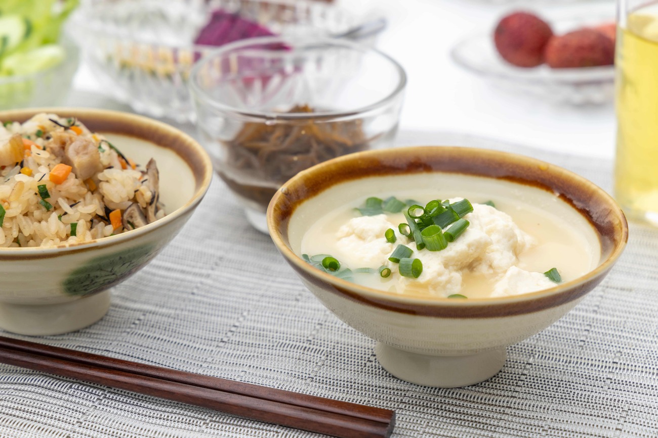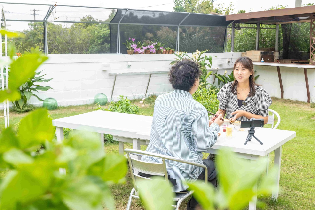優しいご夫妻、のぶちゃんときょ〜ちゃんが営む「K’s Garden」は、もともと1組限定のお宿と体験を提供していましたが、2022年5月に一棟貸しのお宿「島ぬ宿〜おかえり」をオープンしてからは、体験をメインに提供するようになりました。そんなK’s Gardenでおすすめしたいのが、朝ごはん屋さんと収穫体験です。敷地内に植えてある野菜やフルーツを収穫し、その素材で調理したきょ〜ちゃんの真心こもった料理を楽しめます。事前予約をすれば、宿泊していないお客さんも利用可能です。綺麗な芝生のガーデンに置かれた机と椅子で、久米島ならではの朝の味覚を堪能しましょう。提供されるお料理は、久米島の家庭料理です。旬の野菜サラダ、だし巻き卵、ゆし豆腐やサーターアンダギーなど、どんな内容がいただけるかはその時のお楽しみ!特に、琉球地方の伝統料理であるジューシー(炊き込みご飯)は、素材の美味しさが絶妙なバランスで溶け込んだ一杯です。また、沖縄のおやつ作り(サーターアンダギー・紅芋スイーツ)、グルクン釣り(宿泊者の方限定)、アダンの根っこで筆づくりなど、さまざまな体験が用意されています。複数プログラムを予約して体験尽くしの島旅を楽しむのもおすすめです。